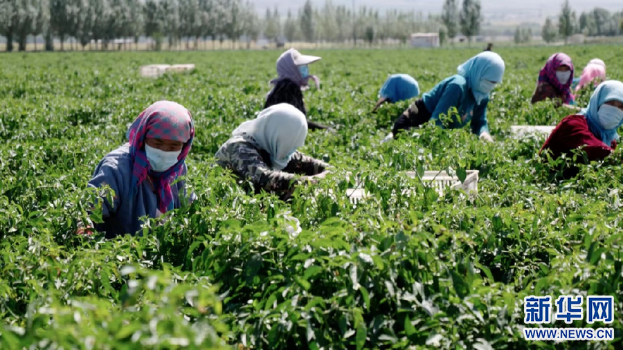 (菜农在兴和县民族团结乡辣椒种植园采摘辣椒。新华网发)